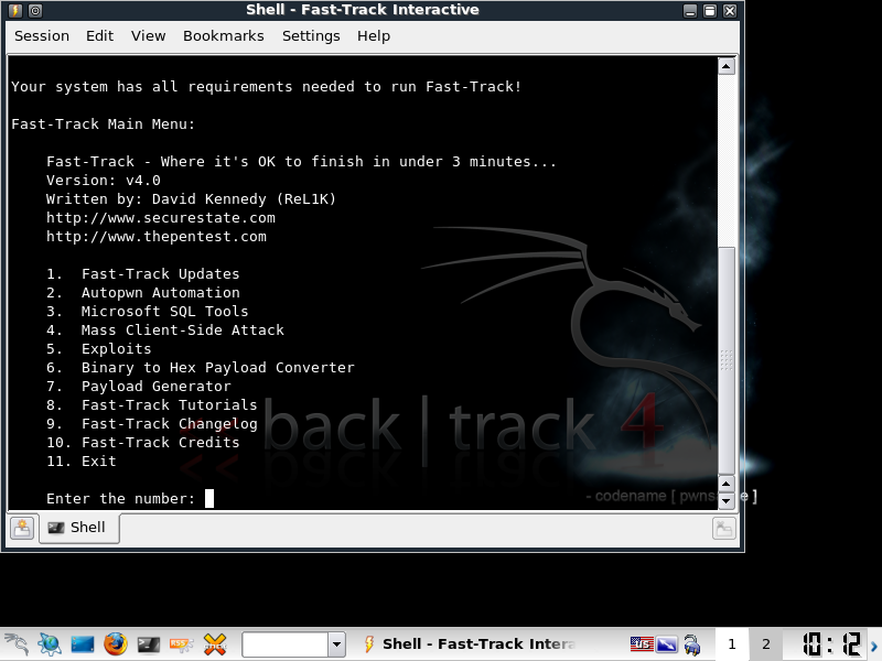 Start by opening Bt 4 etc, then scroll to Backtrack, Penetration, Fast-Track, Fast-Track interactive, this will open a prompt like below.